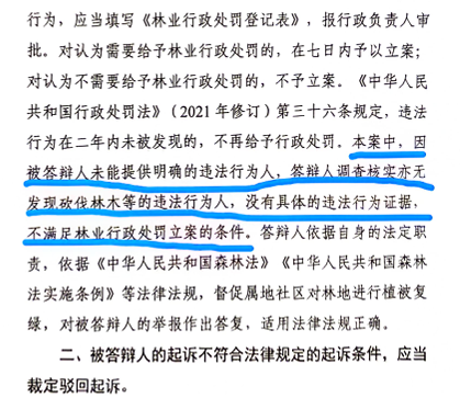 图为社区仅在现场张贴告示的图片,以及林业局将未查处的责任归咎于观音山公司未能提供明确的违法行为人的答辩状截图
