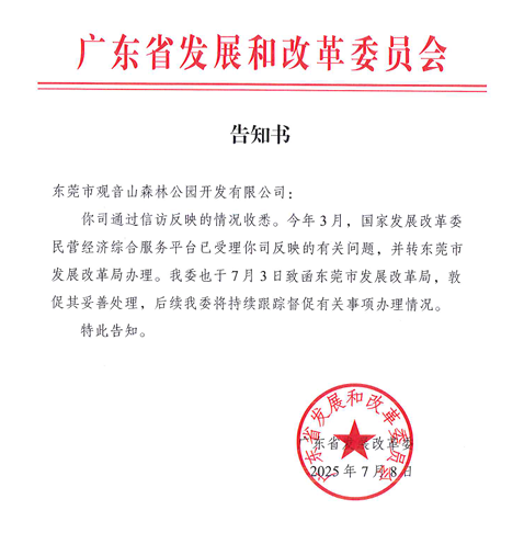 2025年7月8日,观音山公司收到了广东省发展和改革委员会(以下简称“广东省发改委”)出具的《告知书》,该《告知书》明确表示,已收悉观音山公司反映的情况,已将该信访事项转至东莞市发展和改革局(以下简称“东莞发改委”)办理,并致函敦促东莞发改委妥善处理。收到《告知书》后,观音山公司深感欣慰,认为此事终于得到了上级部门的重视,于是在2025年9月3日专门向国家发改委、广东省发改委分别寄送了回函,对其高度重视民营企权益、积极推动信访事项办理的行为表示衷心感谢,并表示将积极配合东莞发改委的调查处理工作,耐心等待处理结果。
