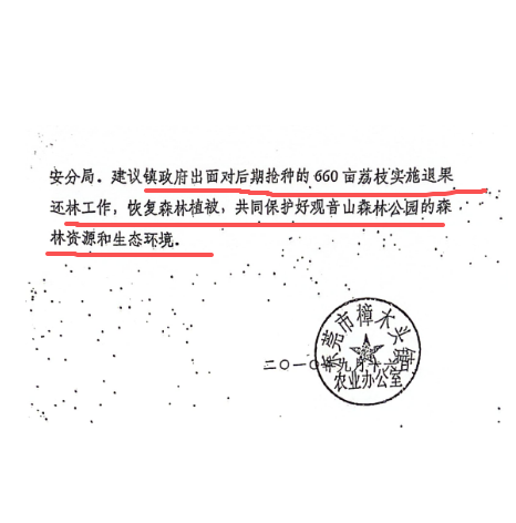 最令人痛心的是660亩原始次生林被毁事件。该事件跨度长达二十余年,观音山公司的多轮举报均未得到有效解决,反而目睹原有森林生态彻底覆灭。1999-2000年观音山公司刚承包公园时,部分村民误信抢种荔枝可获开发赔偿,在仙泉水库周边原始次生林下抢种660亩荔枝苗。2004年公司投诉,东莞林业局森林公安分局以“超行政处罚追诉时限”未作处罚。2009年1月,公司发现树木持续被蚕食且范围在扩大,遂再次举报。随后,东莞市林业局林政科联合森林公安分局、樟木头镇农办、石新居委会及观音山公司开展联合调查,樟木头镇农业办公室2010年9月16日出具的《关于观音山森林公园毁林种果有关情况的复函》明确确认,“毁林种果”范围确为660亩,系1999年至2000年村民抢种所致,且认定“村民在铲草抚育荔枝的过程中,利用傍晚护林员下班之机对荔枝树上的林木进行蚕食的现象肯定存在”, 但市林业局林政科及森林公安分局最终仍以“超追诉期”不予处罚,仅建议镇政府实施退果还林、恢复森林植被。令人愤慨的是,这一“退果还林”建议始终未得到落实,2023年9月,观音山公司发现该片660亩区域不仅毫无还林迹象,原有的原始次生林已彻底消失,只剩下生长茂盛的荔枝树,于是再次向东莞市林业局举报。然而,东莞市林业局在答复中却公然撒谎,声称行政执法人员于9月19日、10月18日两次赴现场“开展了详细调查,现场未发现有660亩林木被毁的情况”,再次以“《行政处罚法》规定违法行为在二年内未被发现的,不再给予行政处罚”为由敷衍塞责,对持续二十余年的毁林事实视而不见。