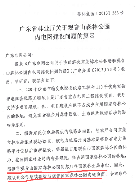 图为省林业厅对广东电网公司的复函