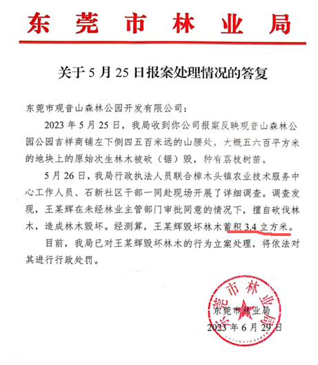 村民王某辉违法砍伐树木事件,则直接暴露了东莞市林业局的包庇袒护行为。2023年5月21日,观音山公司工作人员巡查时发现,公园吉祥商铺左下侧四五百米远的山腰处,五六百平地块上的原始次生林木被毁坏,现场种植了荔枝树苗。经粗略统计,被砍伐的直径从指头粗到碗口粗的树木达百十来棵。公司报案后,有关部门多日未到现场查看,遂再次向东莞市林业局书面报案,并提交了现场拍摄的照片、视频作为证据。但东莞市林业局在2023年6月29日的复函中却谎称,已赴现场详细调查,认定王某辉未经审批擅自砍伐林木,测算毁林蓄积3.4立方米,并称已立案处理将依法处罚。观音山公司通过提起诉讼才发现,林业局所谓的“详细调查”纯属谎言,其甚至未给王某辉做过调查笔录,所谓“3.4立方米”的毁林蓄积也仅为推算结果,与现场实际情况相差巨大。更令人愤慨的是,林业局早在2023年6月19日就已对王某辉作出行政处罚,却在6月29日的复函中刻意隐瞒该事实,且至今未向观音山公司出具《行政处罚决定书》,也未向法院提供,其掩盖包庇王某辉违法行为的意图十分明显。